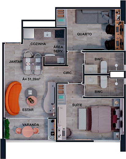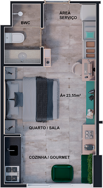 Studios | 2 Quartos | 1 ou 2 Bwc social | Sala de estar e jantar | Varanda Cozinha com área de serviço | Garagem | Área útil de